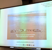 Introduction to how Royal College of Occupational Therapists can support Evidence Based Practice Pauline Macdonald discussed the range of resources RCOT provide to aid our evidences based practice such as hot topics and RCOT fact sheets which summarise relevant evidence on topics. There is upcoming resources being produced to give occupational therapists further information about AMPs, TOMS and COPM as outcome measures. There is also a research newsletter you can sign up for by emailing: Lesley.gleaves@rcot.co.uk, which is well worth signing up for to keep up to date.